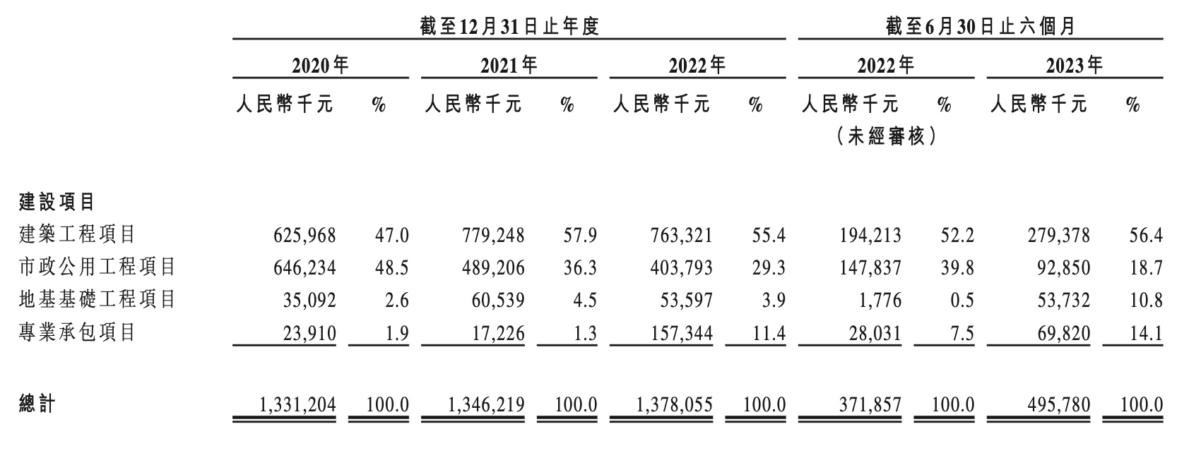 而包括所有城乡公共基础设施建设的市政公用工程项目收入却大幅减少。报告期内,该业务的收入分别为6.46亿元、4.89亿元、4.04亿元及9285万元,收入占比则由2020年的48.5%大幅下滑至2022年的29.3%,2023年上半年更是进一步下滑至仅18.7%。