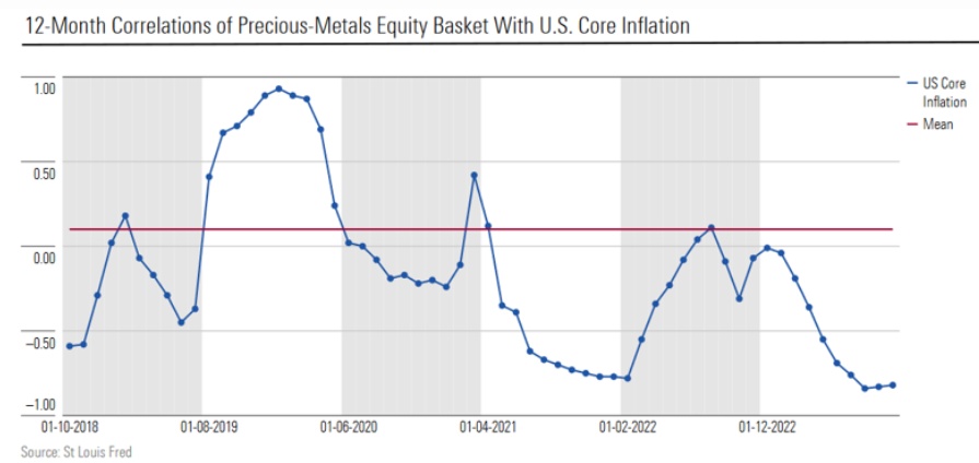 下图显示了过去5年美国核心通胀与一篮子贵金属股票之间的12个月滚动相关性。水平线表示2000-2023年的历史相关性平均值。在新冠疫情期间,随着相关性开始下降,这一篮子股票表现良好。但在2022年熊市期间,相关性开始改善(即负值缩窄),其结果是贵金属一篮子股票回报增加。