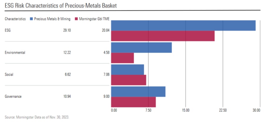 这些公司还存在ESG方面的问题。如下图所示,相对于广泛的股票市场,贵金属篮子的风险得分更高。