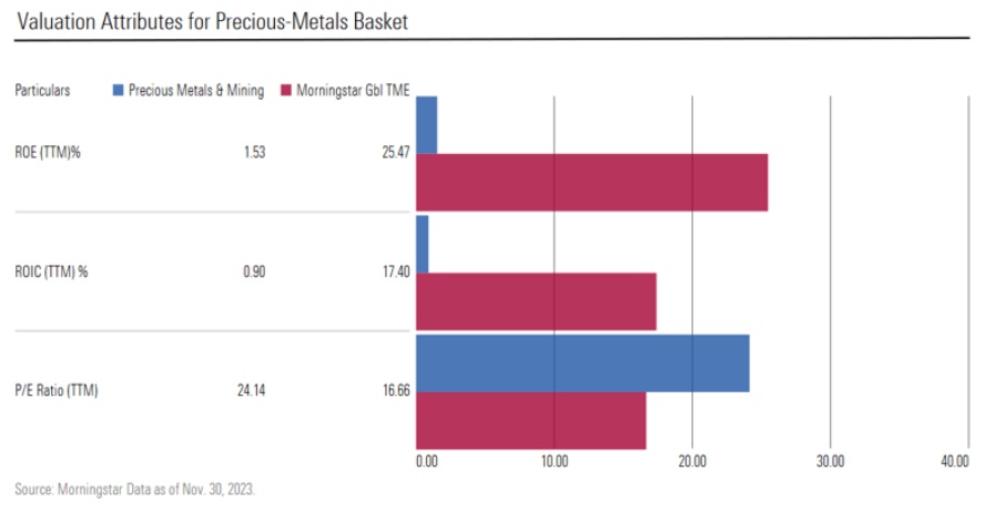 晨星表示,贵金属的估值显然存在挑战。股本回报率(ROE)和投资资本回报率(ROIC)低于大盘,市盈率似乎也过高。较高的市盈率表明,投资者愿意为未来的增长潜力支付更高的价格,在贵金属价格上涨的情况下仍愿意投资,尽管与更广泛的市场相比,贵金属目前的盈利能力较低。