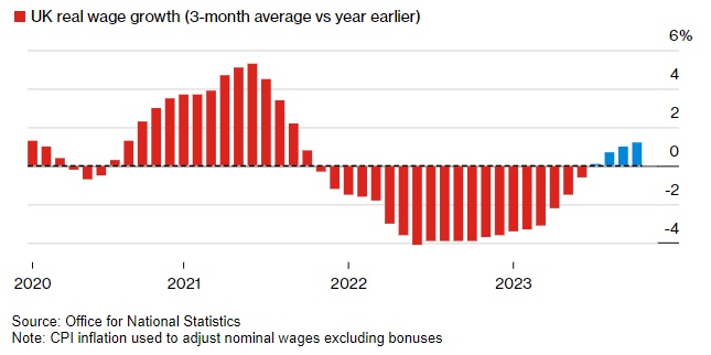 据经济学家的预测,2024年英国经济可能会避免衰退并在下半年加强,因为消费者将从通胀下降和长期生活成本危机的缓解中受益。据彭博社对52位经济学家的调查显示,他们普遍认为财政部和英国央行将在明年为经济实现软着陆,预计增长率为0.3%,从而避免了衰退。