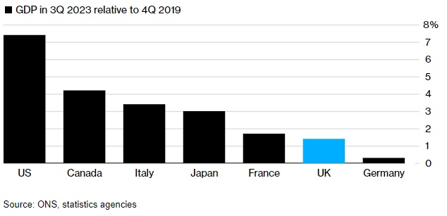 大选必须在2025年1月前举行,如果要由经济来决定选举的结果,从对未来一年的预测来看,英国首相Rishi Sunak最好的机会是等到今年夏天。尽管这些数据表明,英国将与德国一样,在七国集团(G7)的经济增速表中垫底,但在经历了30年来最严重的通胀冲击后,预计明年消费者实际收入也将出现增长。