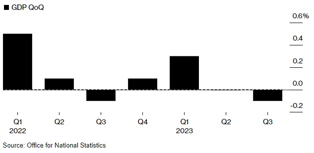 事实上,英国经济的起点并不乐观,其2023年第二季度和第三季度国内生产总值(GDP)的修正表明,英国可能在今年年底陷入衰退。12月22日公布的官方估计显示,第三季度经济萎缩了0.1%,因为消费者收紧了钱包。提交季度预测的经济学家中,将近三分之一的人预计2023年最后三个月将出现萎缩。这将使英国按照连续两个季度负增长的通常定义陷入衰退。