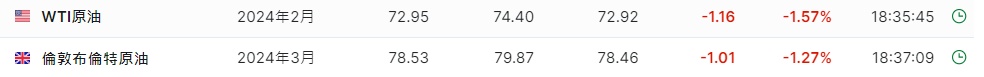 3. 截至发稿,WTI原油跌1.57%,报72.95美元/桶。布伦特原油跌1.27%,报78.53美元/桶。