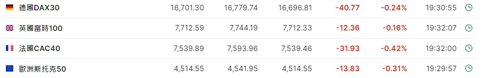 2. 截至发稿,德国DAX指数跌0.24%,英国富时100指数跌0.16%,法国CAC40指数跌0.42%,欧洲斯托克50指数跌0.31%。