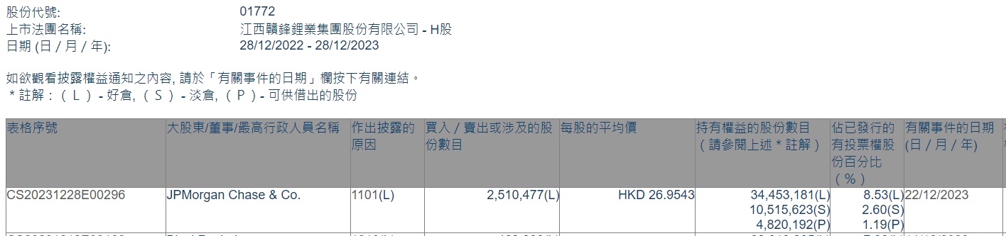 智通财经APP获悉,香港联交所最新资料显示,12月22日,小摩增持赣锋锂业(01772)251.0477万股,每股作价26.9543港元,总金额约为6766.82万港元。增持后最新持股数目约为3445.32万股,最新持股比例为8.53%。