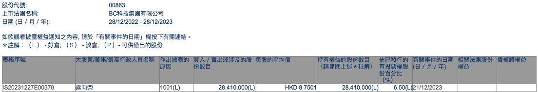 智通财经APP获悉,香港联交所最新资料显示,12月21日,梁向荣增持BC科技集团(00863)2841万股,每股作价8.7501港元,总金额约为2.49亿港元。增持后最新持股数目约为2841万股,最新持股比例为6.5%。
