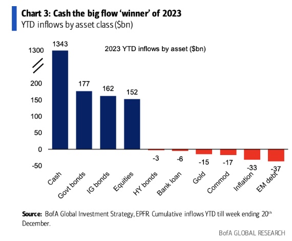 智通财经APP注意到,随着美联储继续其前所未有的紧缩周期,投资者今年纷纷涌入现金资产,资金流入达到1.3万亿美元;而美国债券也出现创纪录的资金流入,美国国债ETF流入了创纪录的1770亿美元,1620亿美元流入投资级债券,而通胀保值债券的赎回规模达到创纪录的370亿美元。