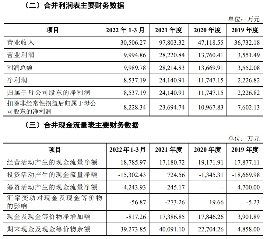 财务方面,于2019年度、2020年度及2021年度,公司实现营业收入分别约为3.67亿元、4.71亿元、9.78亿元。公司净利润分别约为2226.82万元、1.17亿元、2.41亿元人民币。