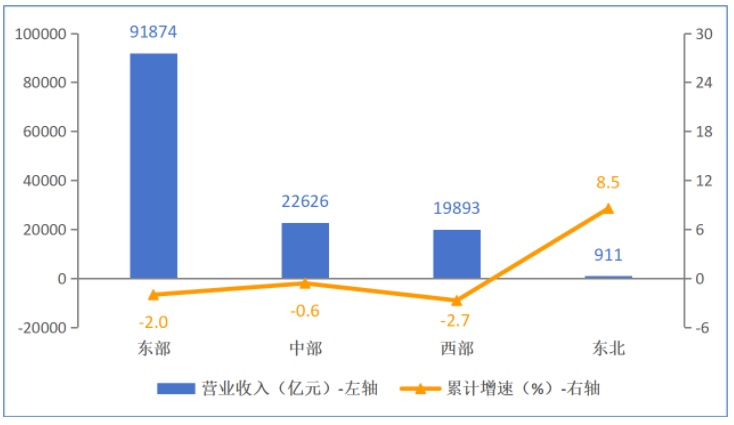 1—11月份,规模以上电子信息制造业东部地区实现营业收入91874亿元,同比下降2%,较1—10月份降幅收窄1个百分点;中部地区实现营业收入22626亿元,同比下降0.6%,较1—10月份降幅收窄3.3个百分点;西部地区实现营业收入19893亿元,同比下降2.7%,较1—10月份降幅加深0.8个百分点;东北地区实现营业收入911亿元,同比增加8.5%,较1—10月份回落0.5个百分点。四个地区电子信息制造业营业收入占全国比重分别为67.9%、16.7%、14.7%和0.7%。