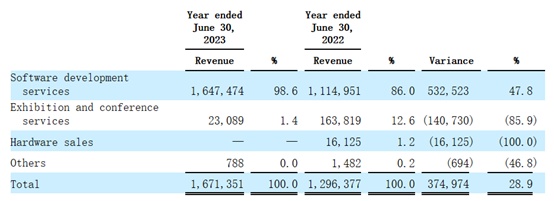 进一步细分来看,该公司的三大业务公表现却并不均衡。软件开发服务业务是公司不折不扣的“顶梁柱”,其2023财年的收入占总收入达到了惊人的98.6%,同比增长47.8%;而展览和会议服务加其他项合共占公司收入剩余的1.4%,并且该分部收入同比大降85.9%;而在2022财年尚有部分“声音”的硬件销售收入到了2023财年内直接归零。