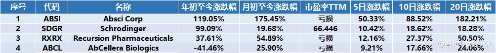 可以看到,市场最近对AI制药的兴趣再次被点燃。最近5个交易日,Absci股价暴涨50%,Schrodinger、Recursion Pharmaceuticals涨幅超过10%。