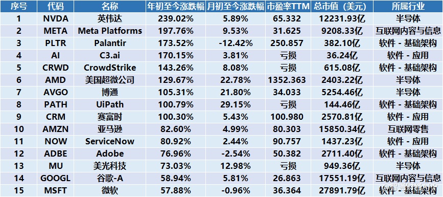 人工智能热潮也推动多只股票疯涨,其中,英伟达年内股价涨幅高达239%,Meta Platforms涨幅达198%,Palantir、C3.ai(AI.US)、CrowdStrike等都实现股价翻倍。