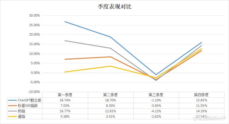 数据显示,今年第三季度,标普500指数下跌3.65%,纳指下跌4.12%,道指下跌2.62%。相比之下,ChatGPT概念股更为抗跌,该季度跌幅为1.1%。