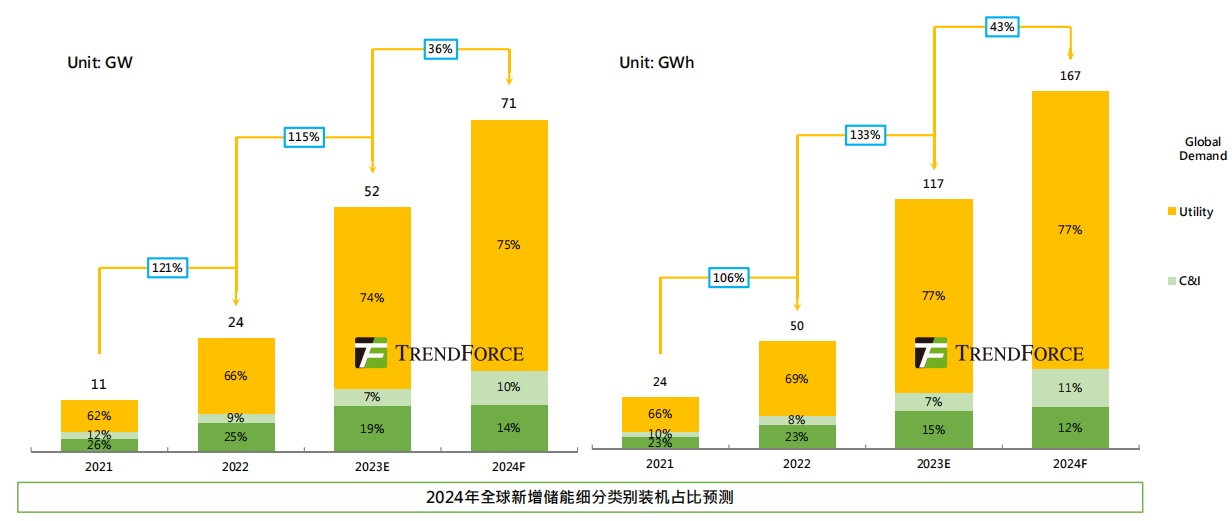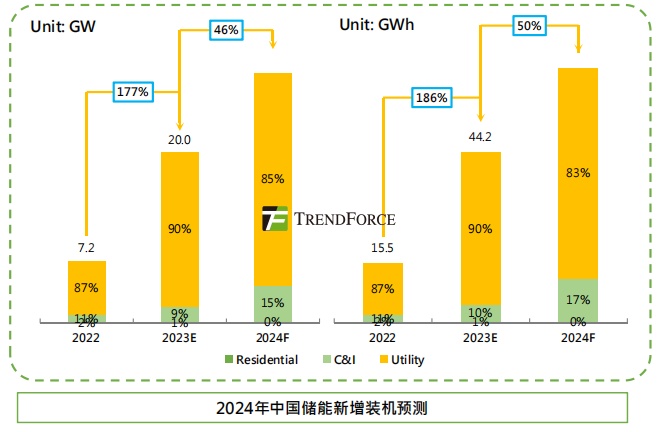 当前,国内储能商业化进程在持续加速,多地出台了明确的装机目标,且鼓励装机的政策推动力度加大,叠加风光消纳问题,大储装机需求呈现持续增长态势,集邦咨询预计中国2024年新增大储装机24.8GW/55GWh。