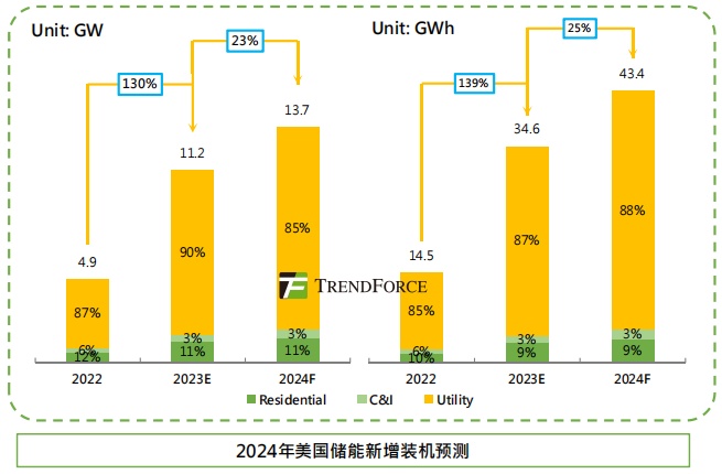 今年,美国市场因供应链问题以及储能并网管道拥挤等问题影响,2023年装机表现低于预期。其中,受影响最大的是大储类别,并网延迟的现象较为严重,对于需求的释放形成一定程度的抑制。2024年美国装机需求整体将呈现增速放缓的趋势,但预计大储装机仍保持亮眼成绩,集邦咨询预计美国2024年新增大储装机11.6GW/38.2GWh。