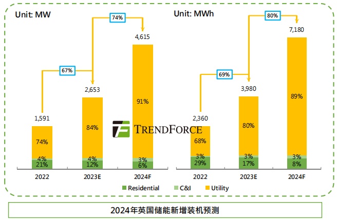 此外,英国储能项目大规模放量并网的时间节点亦集中在24年。在上述数据的支撑下,集邦咨询预计2024年英国大储新增装机有望达4.2GW/6.4GWh。
