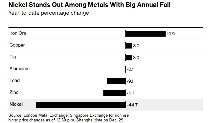 在伦敦金属交易所(LME),用于不锈钢和电动汽车电池的金属价格有望出现逾40%的年度跌幅,为2008年以来的最大跌幅。这是迄今为止工业金属中表现最差的,与铜价3%的涨幅和新加坡铁矿石约20%的涨幅形成鲜明对比。