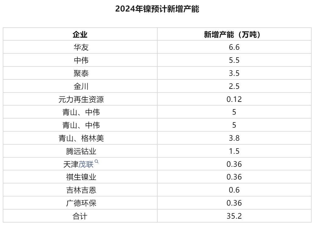 电积镍产能释放的背后逻辑是硫酸镍与纯镍价格的倒挂,利润驱动下的投产使纯镍市场由供应偏紧转向过剩。据不完全统计,2024年新投产产能约35.2万吨,预计2024年新增电积镍产能将进一步扩张。但短期看,产业因素驱动原料坚挺,宏观因素驱动镍价超跌,电积镍生产逼近成本线,投产进度或将放缓。