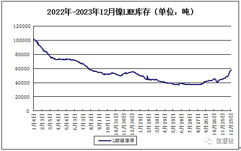 据上图所示,2023年1-8月LME镍库存小幅下跌,处在一个较低水平,后来,随着新增电积镍产量持续放量,下游需求增速有限,9月份开始,镍库存持续累积。截止年末,LME镍库存57804吨,较年初上涨4.4%。在未来会有更多新增品牌注册成为交割品,从而镍显性库存将会持续增加。预计2024年纯镍累库趋势将延续。