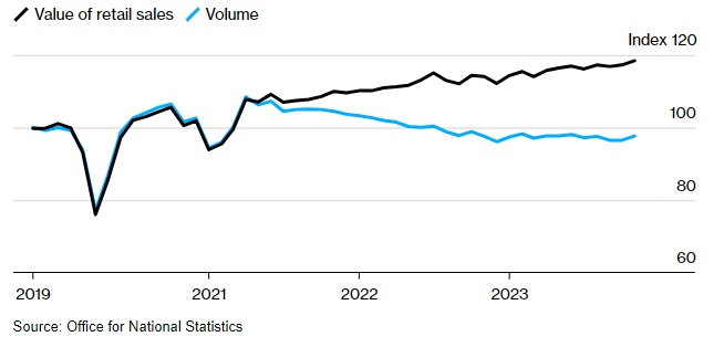 此外,据巴克莱信用卡(Barclaycard)的另一项数据显示,尽管物价不断上涨,但2023年的卡消费仅增长了4.1%,不到一年前10.6%增长的一半,且接近通胀率。这些数据表明家庭已减少在服装、外出就餐和家庭装修上的开支。