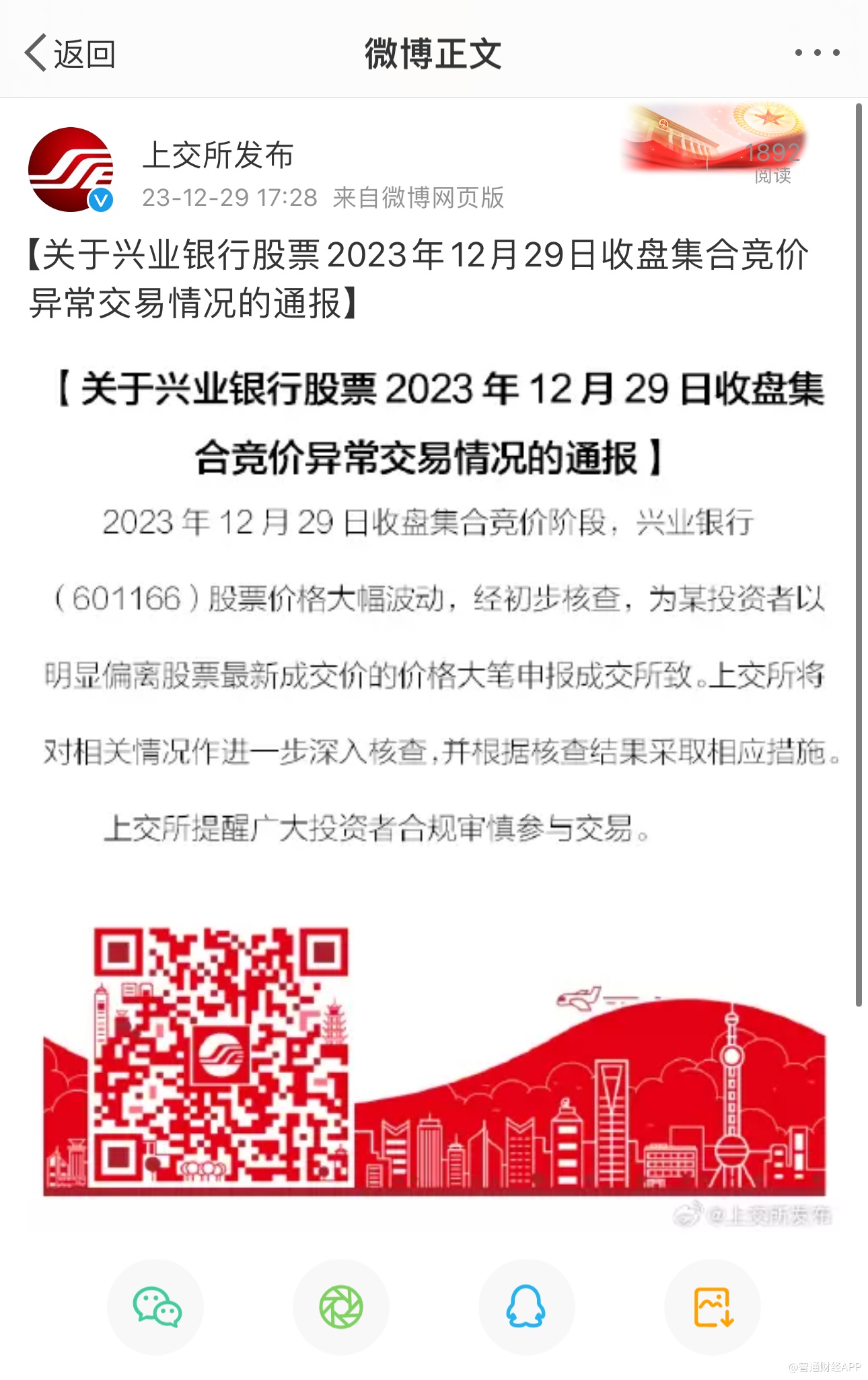 智通财经APP获悉,12月29日晚间,上交所发布关于兴业银行(601166.SH)2023年12月29日收盘集合竞价异常交易情况的通报,经初步核查,为某投资者以明显偏离股票最新成交价的价格大笔申报成交所致。上交所将对相关情况作进一步深入核查,并根据核查结果采取相应措施。