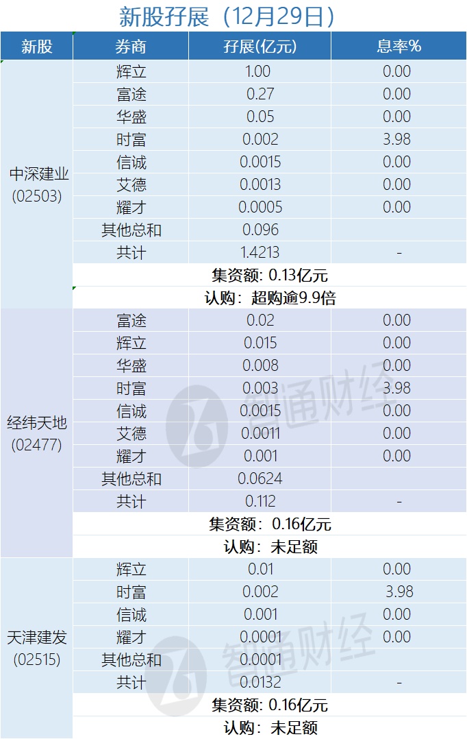 智通财经APP获悉,中深建业(02503)、经纬天地(02477)、天津建发(02515)正在招股中。截至12月29日,辉立、时富等券商合计为中深建业借出孖展1.4213亿港元,超购逾9.9倍;为经纬天地借出孖展0.112亿港元,认购未足额;为天津建发(02515)借出孖展0.0132亿港元,认购未足额。