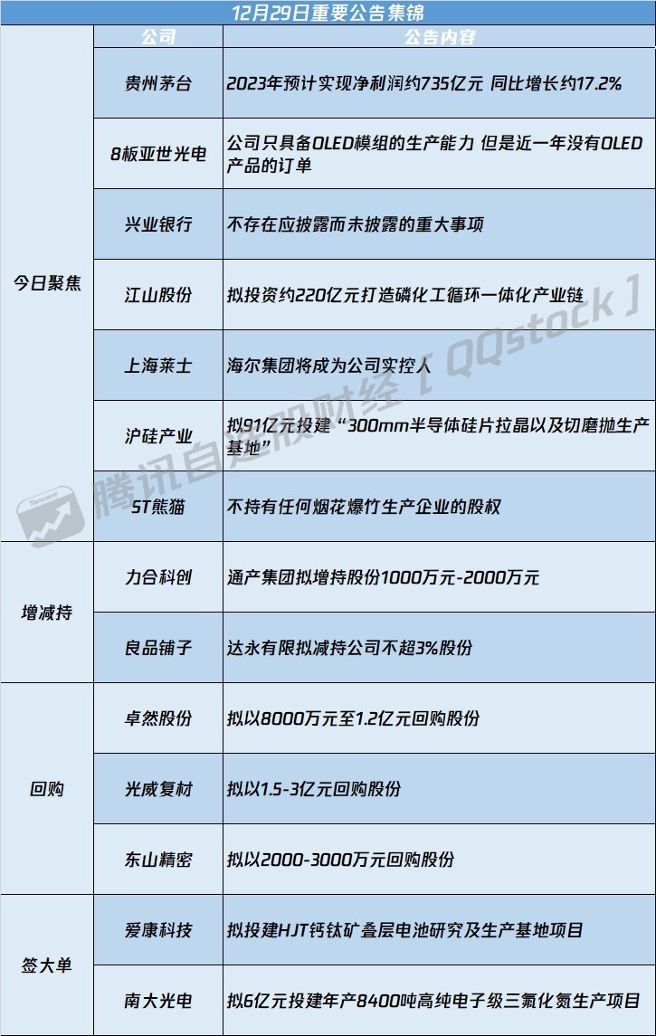 贵州茅台公告,初步核算,2023年度,公司生产茅台酒基酒约5.72万吨,系列酒基酒约4.29万吨;预计实现营业总收入约1495亿元(其中茅台酒营业收入约1258亿元,系列酒营业收入约204亿元),同比增长约17.2%;预计实现归属于上市公司股东的净利润约735亿元,同比增长约17.2%。小财注:Q3净利168.96亿元,据此计算,预计Q4净利206.24亿元,环比增长22%。
