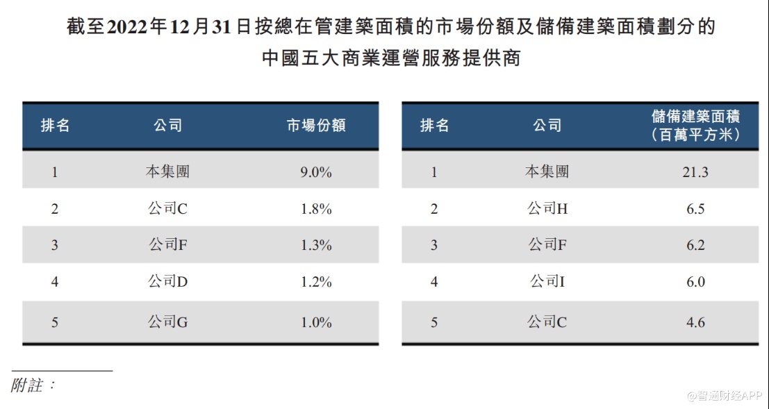 根据万达商管招股书,公司为中国最大的商业运营服务提供商,在管建筑面积在中国超过第二名至第十名的总和,储备项目建筑面积也在中国排名第一,截至2022年底,万达商管也是中国唯一向独立第三方大规模输出管理的商业运营公司,管理的独立第三方商业广场数量全国排名第一。