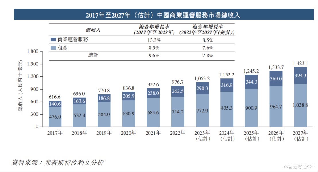 从行业角度看,商业运营服务提供商在经营活动中创造现金流的难度或将加大。根据弗若斯特沙利文报告,2017年至2022年,中国商业运营服务市场的总收入由人民币6166亿元增加至人民币9767亿元,复合年增长率为9.6%。2027年,商业运营服务市场总收入预计将达到人民币1,4231亿元,预计2022年至2027年的复合年增长下降至7.8%。
