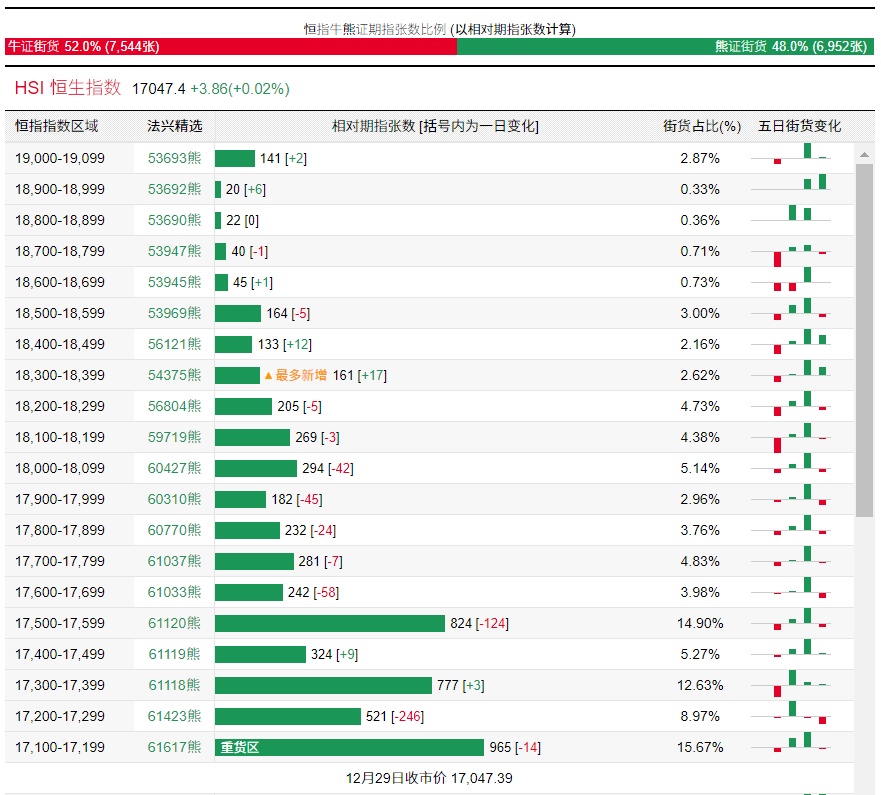 智通财经APP获悉,截至12月30日,恒指最新的牛熊街货比例为52:48。