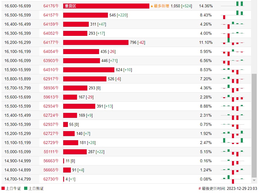 牛证街货重货区和最多新增都在16600-16699区间,该区间最新牛证数量为1050张,较上一交易日增加524张。