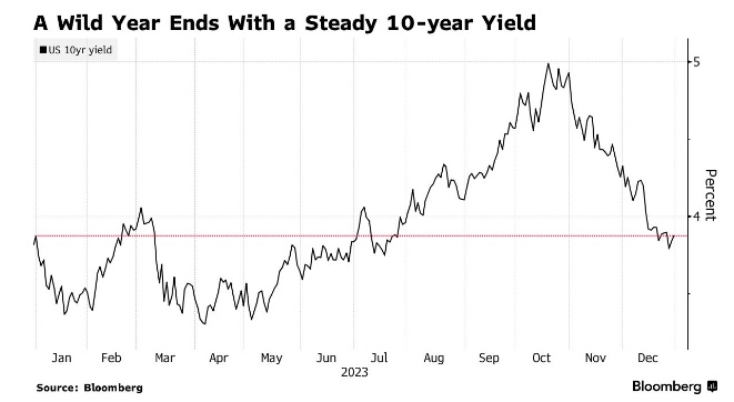 智通财经APP获悉,在经历了一年的大幅波动和多次假突破后,美国10年期国债收益率在2023年结束时几乎又回到了年初的水平。
