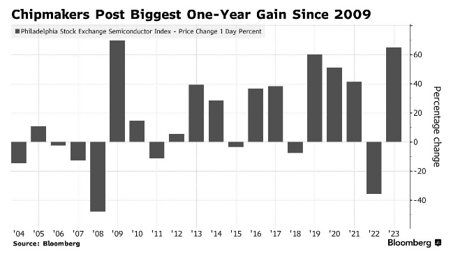 数据显示,截至2023年最后一个交易日收盘,费城证交所半导体指数全年上涨约65%,创2009年以来最大年度涨幅。周五该指数虽然收跌0.8%,但仍接近创纪录水平。
