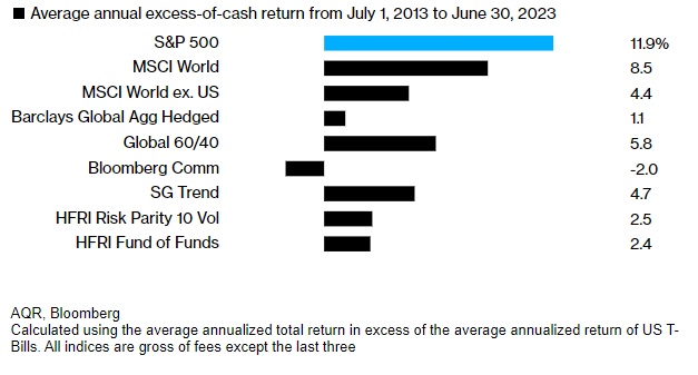 据了解,布鲁克斯的分析关注的是截至今年六月的十年,但其结果对于此后又增加了7%的市场依然适用。他计算的标普500指数的回报率,在扣除国库券收益后,为该十年的每年11.9%,击败了从非美国发达市场股票到大宗商品到复杂的量化策略等所有标的。