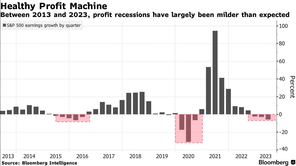 最后,在当前市场对人工智能和美联储紧缩结束的狂热情绪中,分析师们看到收益飙升。根据数据显示,市场预期2024年利润增长11%,2025年增长12%。但像这样的增长是罕见的。美股盈利最后一次在连续两年(即2017年和2018年)实现了两位数的增长。