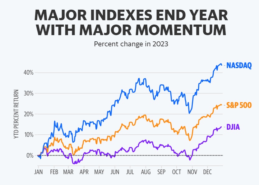 在刚刚过去的2023年年底,一轮持续两个月的涨势将美股三大指数推至创纪录或接近历史最高点的水平。道琼斯指数在2023年上涨了13.7%,涨幅超过4500点,有史以来首次突破37000点。标普500指数上涨24%,使该指数接近创纪录的收盘点位4796.56点。与此同时,覆盖众多知名科技股的纳斯达克综合指数(Nasdaq Composite)上涨43.42%,创下自2020年以来的最佳年回报率。