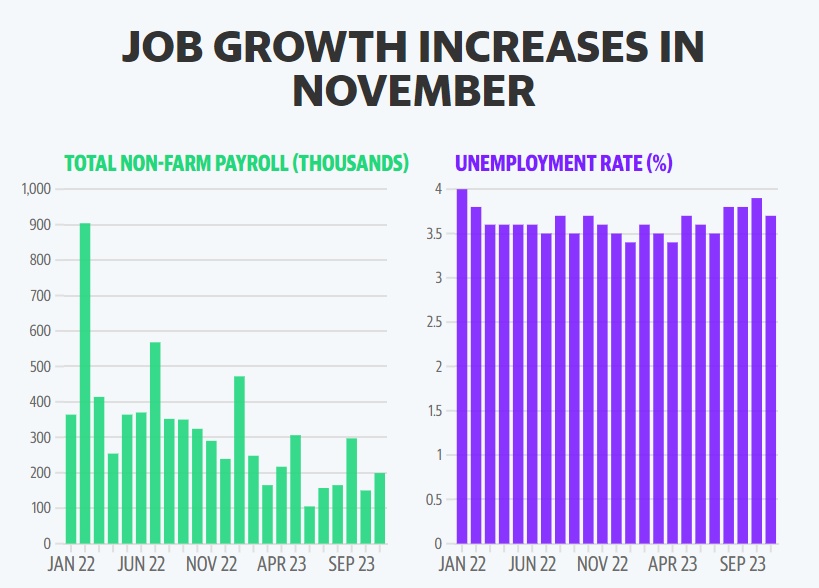 经济学家们对12月份就业报告的预期也反映了类似的情况。根据机构的统计数据,经济学家们普遍预计该报告将显示,上个月(12月)美国新增16.8万个非农就业岗位,而失业率则小幅上升至3.8%。11月,美国增加19.9万个非农就业岗位,而失业率出人意料地维持在3.7%。