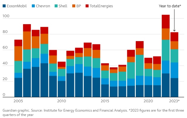 智通财经APP获悉,在公众对化石燃料公司巨额利润日益愤怒的背景下,世界五大上市石油公司预计将在2023年向其投资者支付超过1000亿美元(约790亿英镑)的创纪录回报。