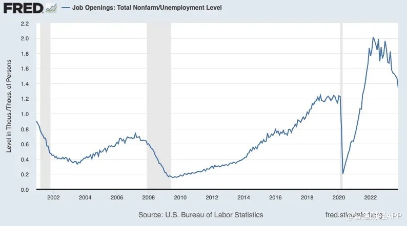 根据美国劳工统计局的调查,2023年10月份职位空缺降至873万个,远低于市场预期,也低于2022年3月1203万个的高点。