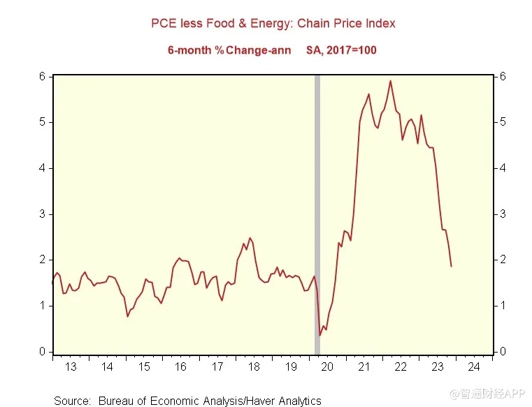 根据美国经济分析局(BEA)的数据,2023年11月份核心PCE物价指数环比仅上升0.1%。按六个月年率计算,这一指标保持在1.9%的稳定水平。