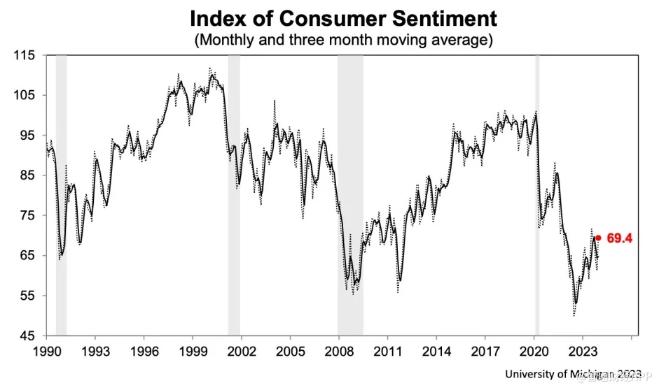 根据密歇根大学的报告,2023年12月份消费者信心指数飙升13%,抹去了此前四个月的所有跌幅,这主要是基于通胀预期轨迹的改善。