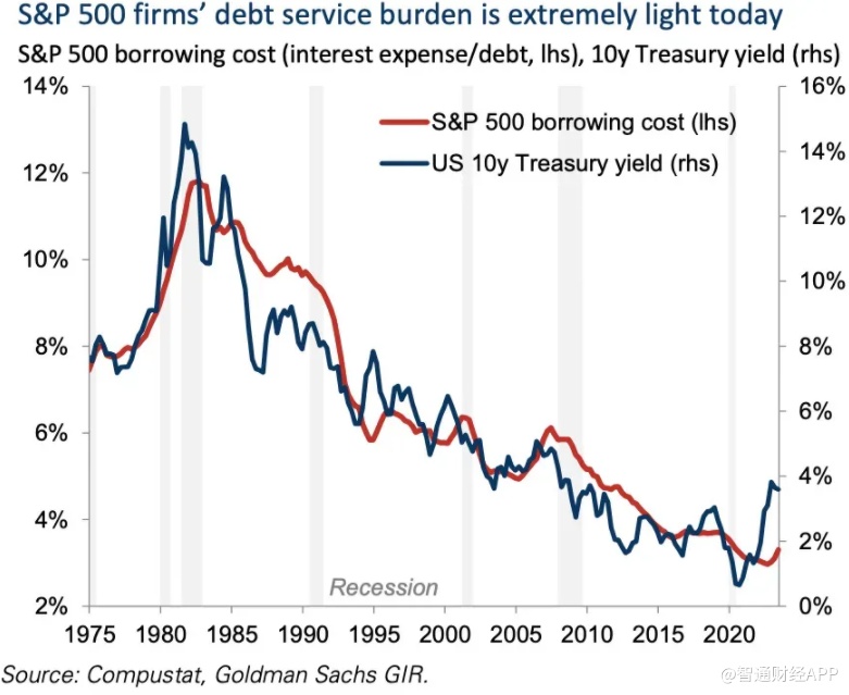 在标普500指数成份股公司中,近一半公司的债券将在2030年之后到期,而利息支出在利率上升的情况下并没有真正发生变化。