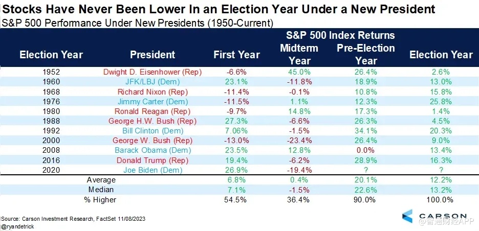 Carson Group首席市场策略师Ryan Detrick表示:“在新总统上任的选举年中,股市一直走高!过去10次都上涨和12.2%的平均涨幅不容忽视,这与2024年可能出现的低两位数回报率一致。”