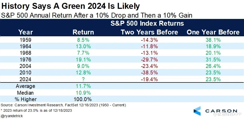 Detrick还表示:“当股市下跌超过10%(如2022年),然后上涨超过10%(如2023年),接下来的一年往往相当稳定。六次类似情形均录得上涨,平均涨幅为11.7%。”