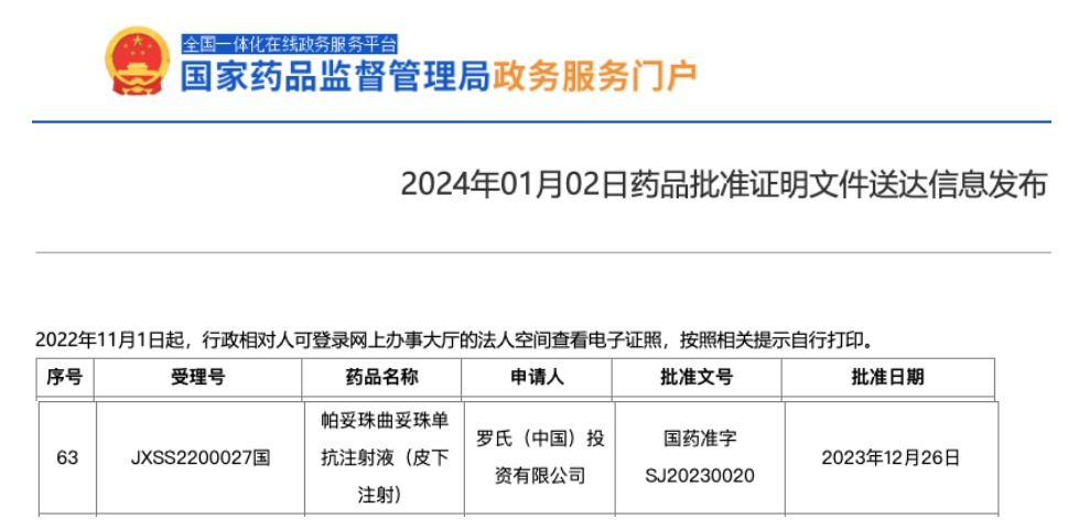智通财经APP获悉,1月2日,据NMPA官网显示,罗氏(RHHBY.US)帕妥珠单抗曲妥珠单抗注射液(皮下注射)在国内获批上市(JXSS2200027)。2020年6月,该产品在美国首次获批上市,商品名为Phesgo。Phesgo(pertuzumab/trastuzumab/hyaluronidase)皮下注射液是由帕妥珠单抗和曲妥珠单抗与透明质酸酶构成的一种固定剂量组合,用于治疗早期和转移性HER2阳性乳腺癌患者。