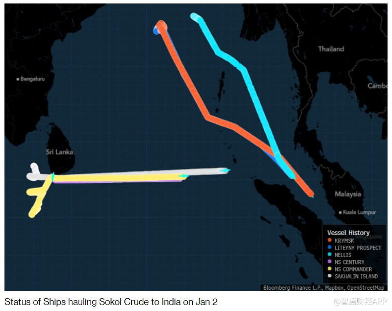 智通财经APP获悉,据报道,许多运输俄罗斯原油的船只此前一直在印度附近徘徊,如今正驶离印度向东航行。由于印度炼油厂对向俄罗斯支付石油款项感到担忧,上月运往印度的俄罗斯原油数量大幅下降。船只跟踪数据显示,从俄罗斯远东地区装载索科尔石油的5艘船只——“NS Commander”号、“Sakhalin Island”号、“Krymsk”号、“Nellis”号和“Liteyny Prospect”号——正以7到10节的速度驶向马六甲海峡。第6艘同样装载索科尔石油的“NS Century”号仍然靠近斯里兰卡。