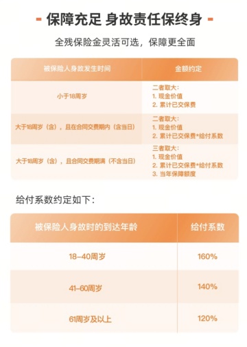 1、保障持续终身,保额年年递增:自第二个保单年度起,保单利益稳健增长,保额每年按照3%的幅度递增,保障越久保额越高,有效抵制通胀。以30岁男性为例,在包含可责任、月缴1000元、缴费期间为10年的情况下,60岁时保障额度可达19.35万元,90岁时保障额度可达46.96万元。