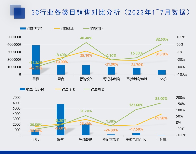 另外,手机市场作为3C消费市场中的重要组成部分,一直是3C/IT电商的营收重点。但在2023年1-7月,手机线上总销量为1011万件,同比去年下降20.5%;销售额为390.7亿元,同比去年下降16.2%。