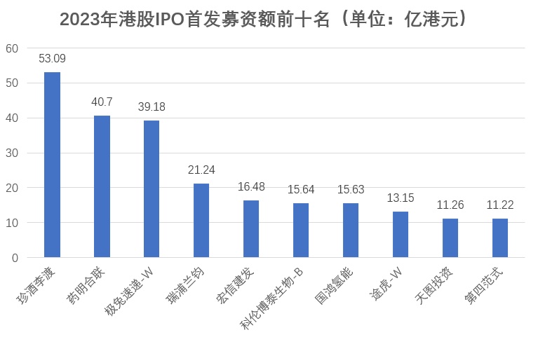 除了IPO数量上的下滑,规模似也不如以往。智通财经APP了解到,全年首发融资额最高的五只新股分别为珍酒李渡(首发融资53.09亿港元)、药明合联(40.7亿港元)、极兔快递-W(39.18亿港元)、瑞浦兰钧(21.24亿港元)、宏信建发(16.48亿港元)。